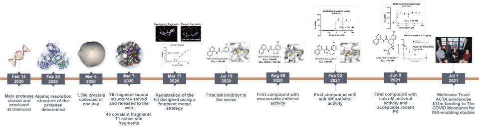 Временная шкала, иллюстрирующая прогресс COVID Moonshot от первоначального скрина фрагмента 7 марта 2020 года до финансирования ACT-A 1 июля 2021 года.